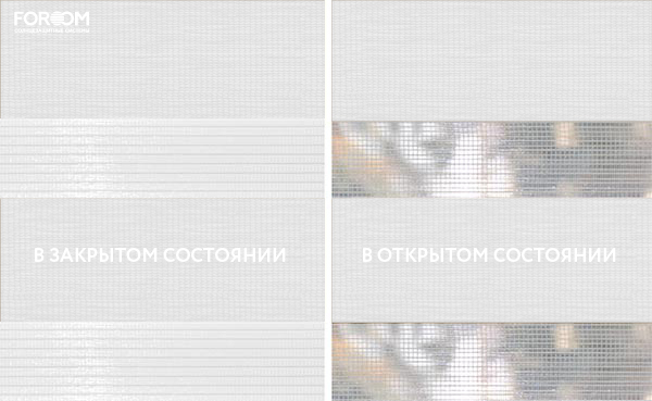 Полотно ткани, состоит из чередующихся горизонтальных полос – прозрачных и непрозрачных. Изменяя положение этих полос относительно друг другу, можно создать целых 3 режима регулировки светом. Например, чтобы в помещении стало светлее, нужно расположить прозрачные полосы друг напротив друга. Если разместить прозрачную и непрозрачную полосу параллельно друг другу, то можно добиться практически полного затемнения.