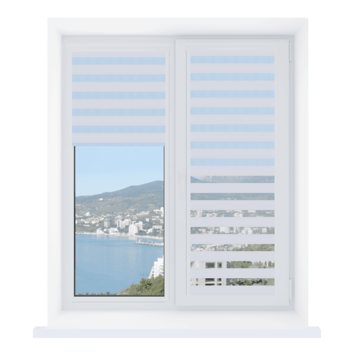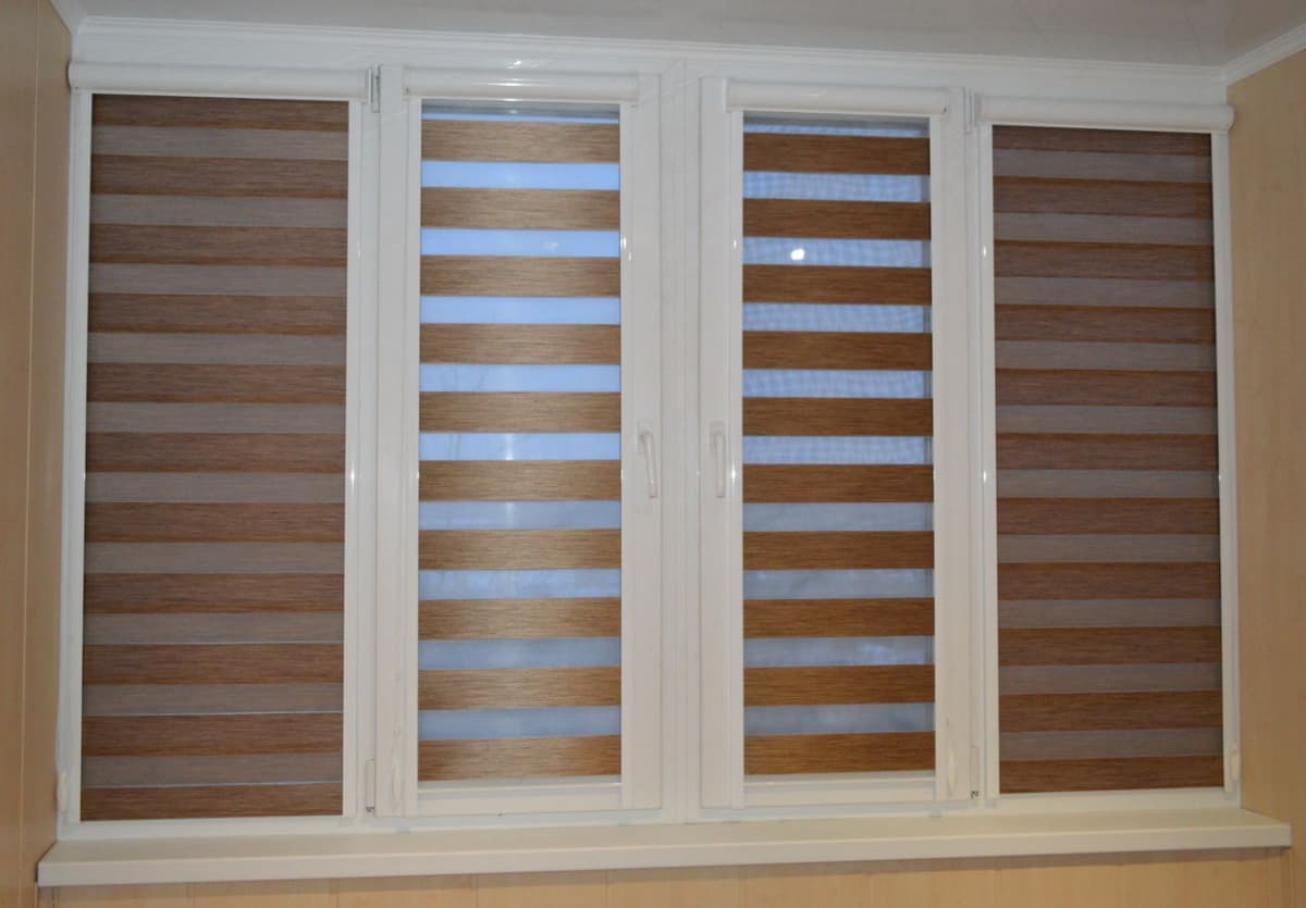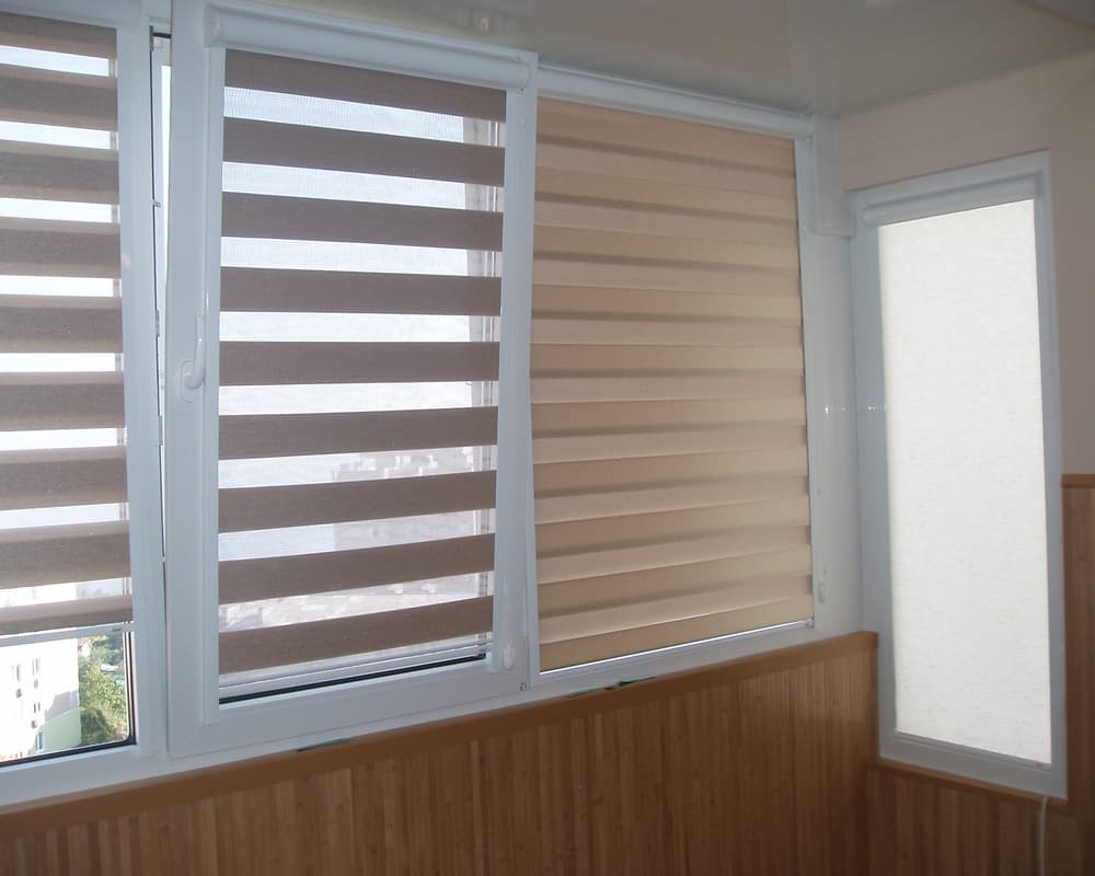 - Регулировка освещения. Возможность гибко управлять световым потоком, чередуя прозрачные и плотные полосы ткани, позволяет добиться как рассеянного света, так и полного затемнения, а также полностью открыть световой проем окна.